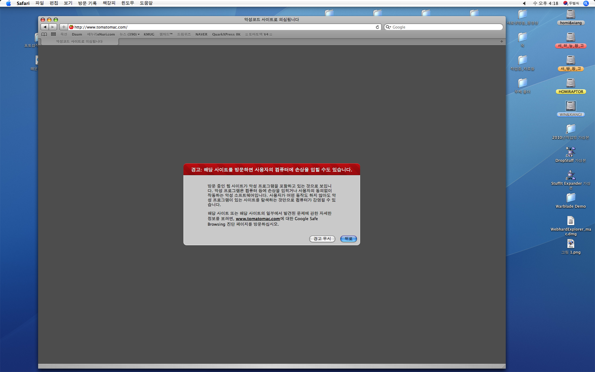 맥에서 토맥만 들어가면 이런메세지가... 뜨면서 협박(?)을 하네요.